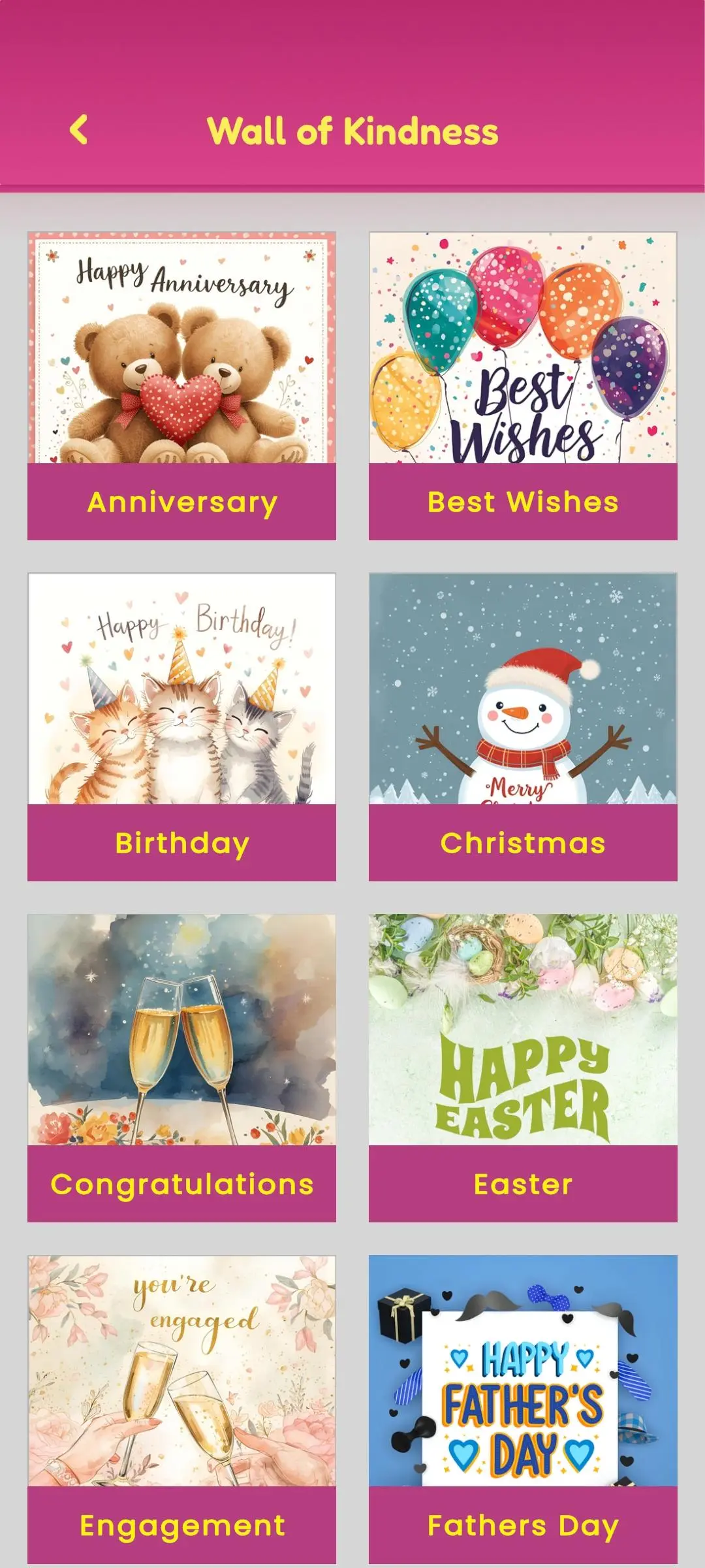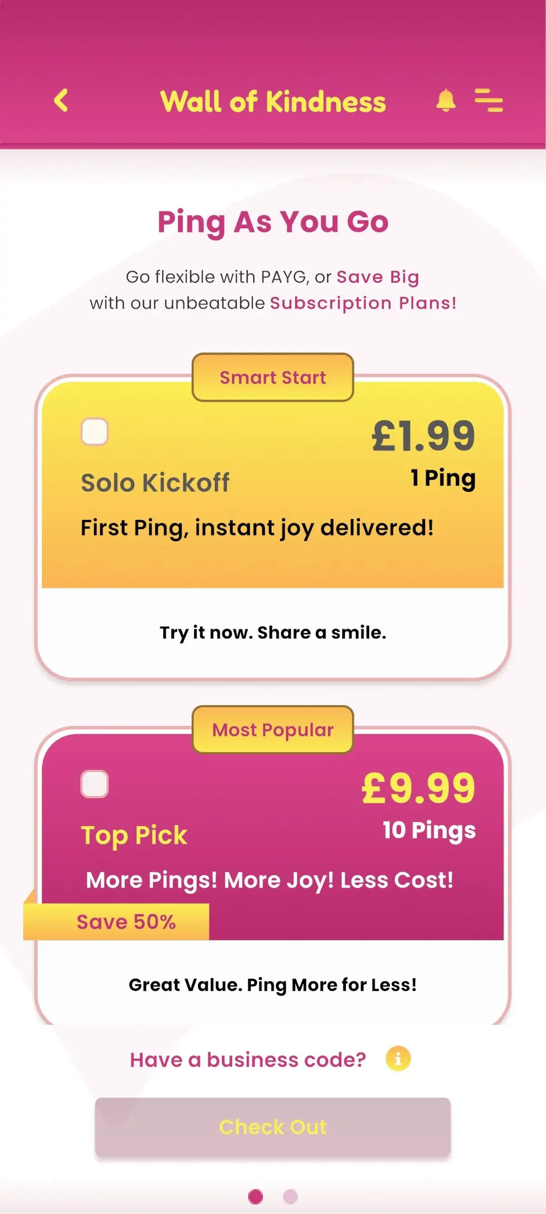 Users can choose to pin their Ping to the Wall of Kindness — a global, comment-free space dedicated entirely to positivity. Each Ping becomes part of a growing collection of uplifting messages, helping build a joyful community where kindness lives on.
